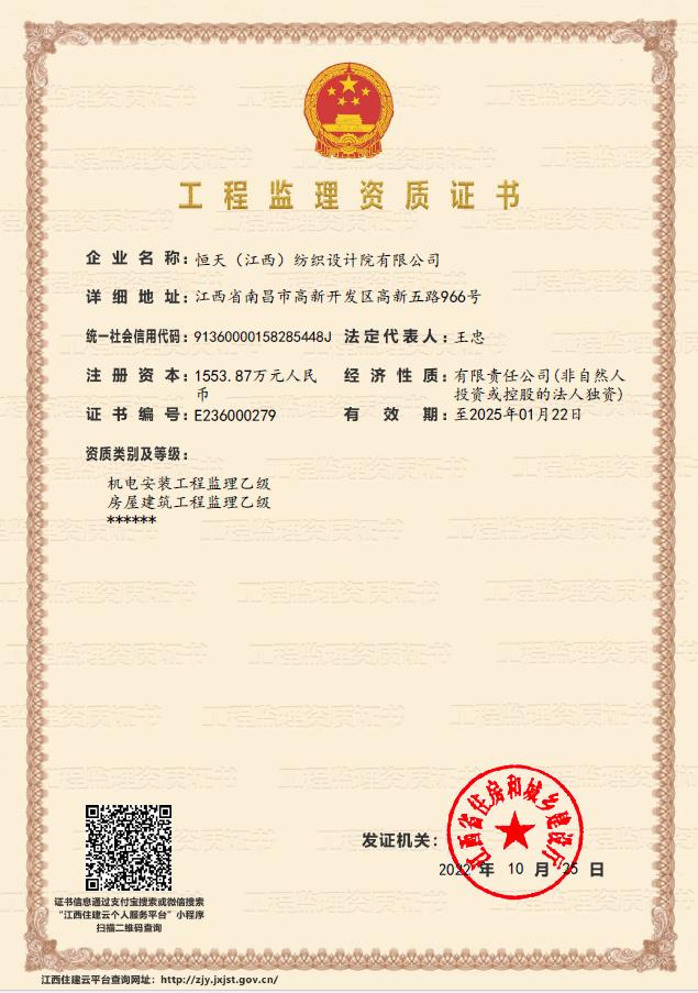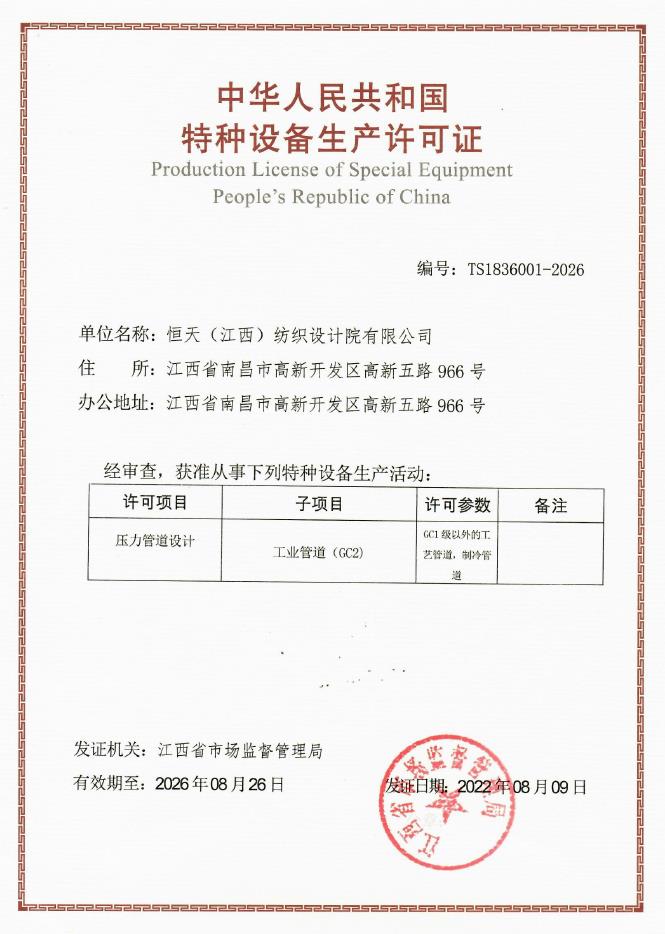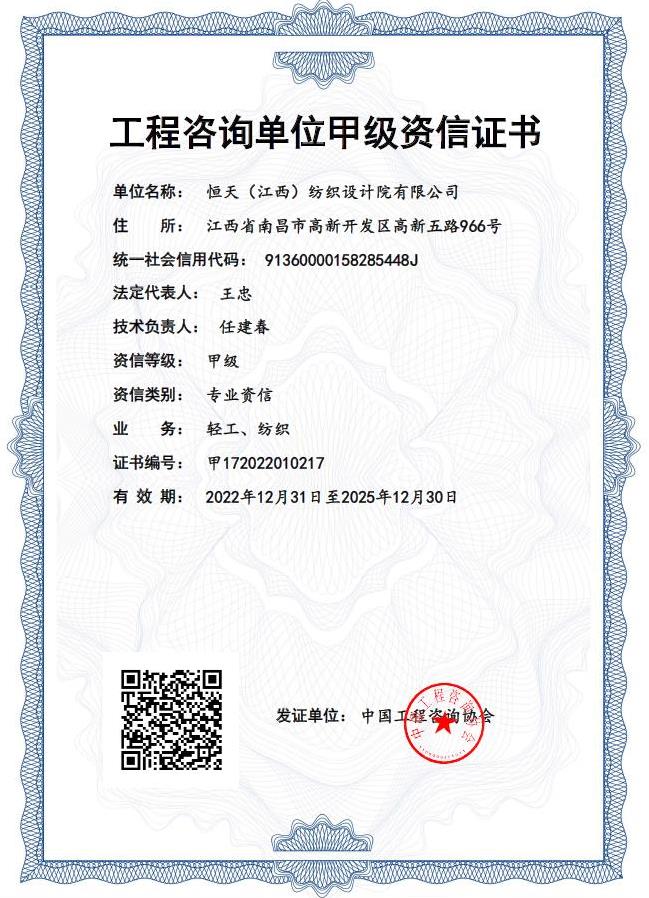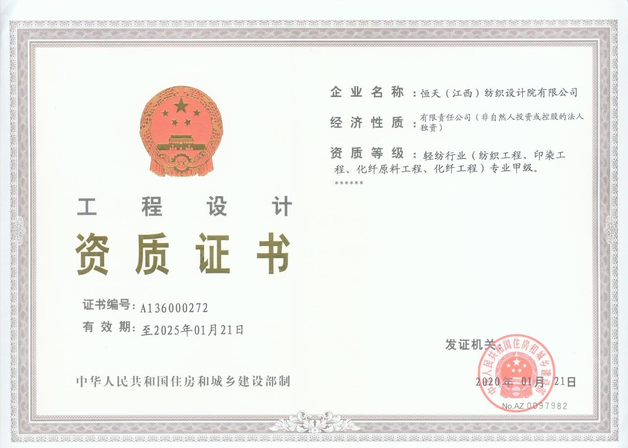 江西设计院(CHJTDI)拥有国家建设部批准的轻纺行业(纺织工程、印染工程、化纤工程和化纤原料)甲级工程设计资质证书,可从事资质证书许可范围内相应的建筑工程总承包业务以及项目管理和相关的技术与管理服务。建筑行业(建筑工程)乙级工程设计资质证书,电力行业(变电工程)专业丙级;纺织、化纤专业甲级工程咨询单位资格证书,建筑专业乙级工程咨询单位资格证书,工程监理乙级资质证书;压力容器、压力管道设计许可证。