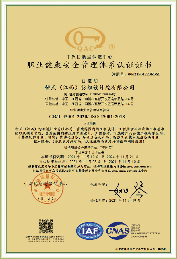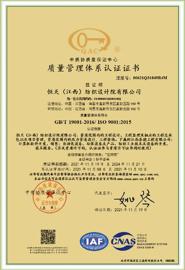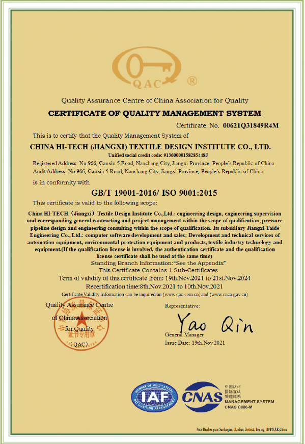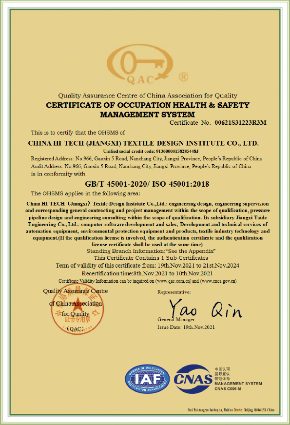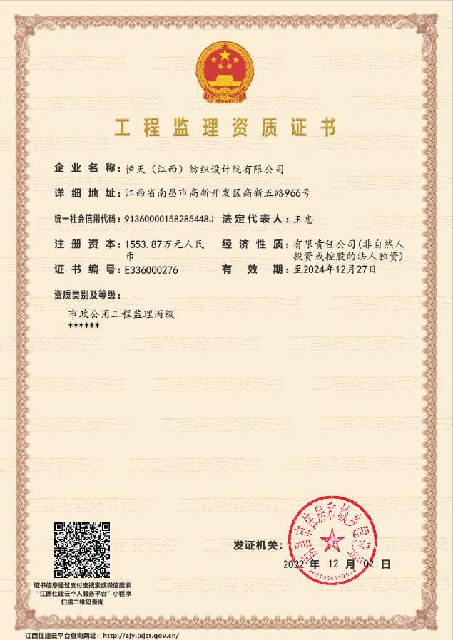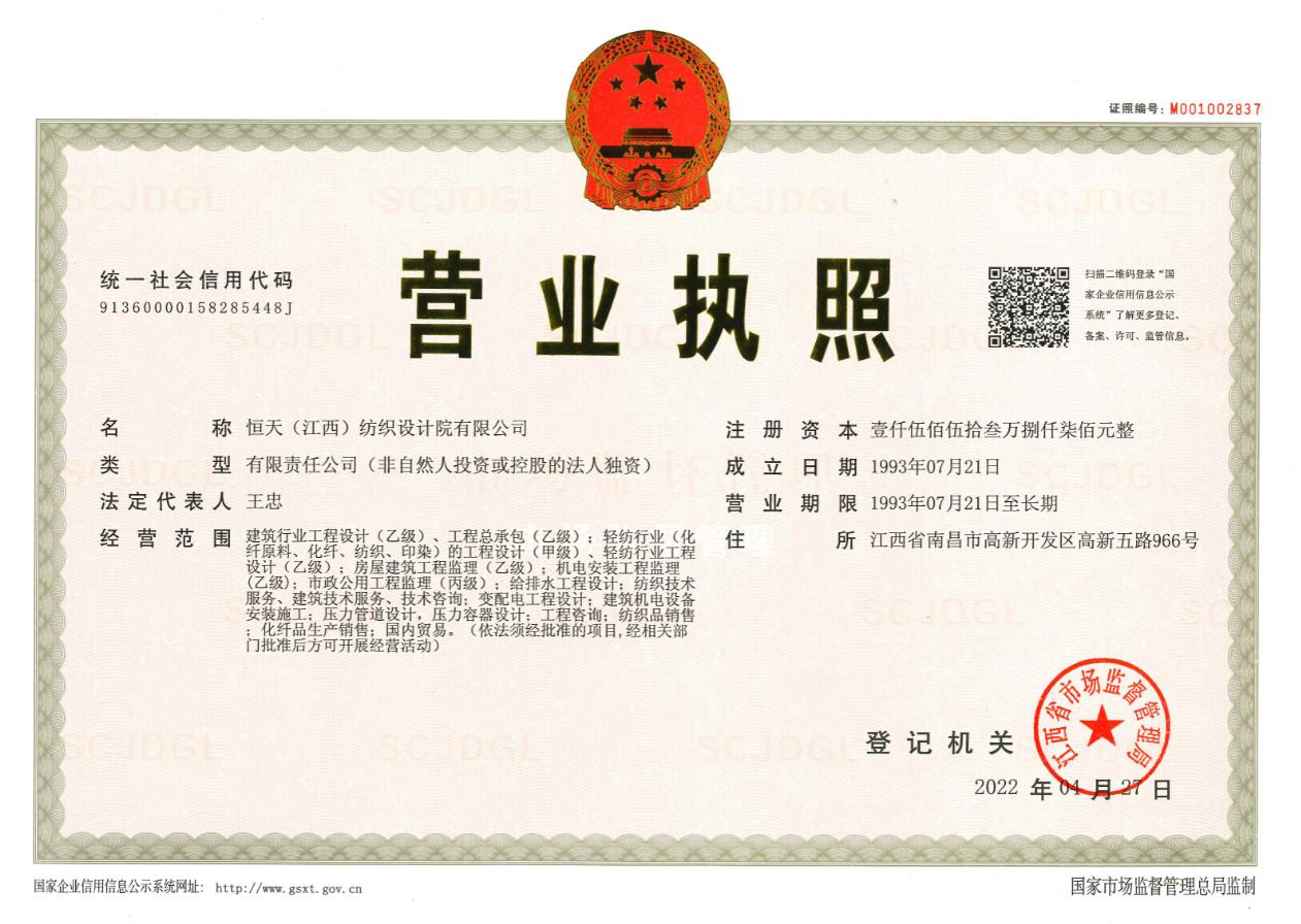 江西设计院(CHJTDI)拥有国家建设部批准的轻纺行业(纺织工程、印染工程、化纤工程和化纤原料)甲级工程设计资质证书,可从事资质证书许可范围内相应的建筑工程总承包业务以及项目管理和相关的技术与管理服务。建筑行业(建筑工程)乙级工程设计资质证书,电力行业(变电工程)专业丙级;纺织、化纤专业甲级工程咨询单位资格证书,建筑专业乙级工程咨询单位资格证书,工程监理乙级资质证书;压力容器、压力管道设计许可证。