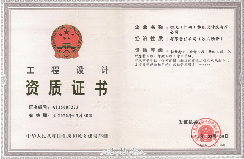 公司资质齐全,通过质量管理体系、环境管理体系、职业健康和安全管理体系认证。现拥有国家建设部批准的轻纺行业(纺织工程、印染工程、化纤工程和化纤原料)甲级工程设计资质证书;建筑行业(建筑工程)乙级工程设计资质证书,电力行业(变电工程)专业丙级;纺织、化纤以及建筑专业的工程咨询资格证书;工程监理乙级资质证书;压力容器、压力管道设计许可证。