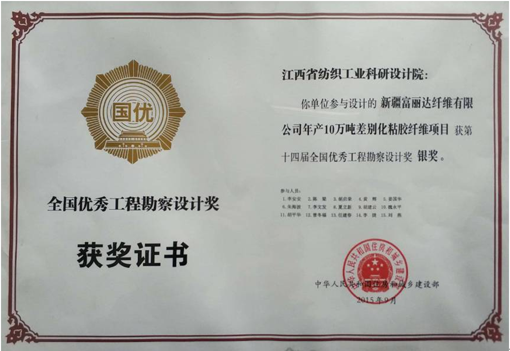 公司紧跟纺织行业新技术,紧盯行业发展趋势,创新引领,追求卓越,开发新技术。公司负责的保定天鹅股份有限公司年产30000吨溶剂法纤维素短纤维技术改造项目施工图设计,获得国家建设部优秀工程设计奖,项目投产后以稳定性好消耗低产品质量优等优势,打破国外技术垄断,推动了新技术在国内的产业化应用,一举奠定了江西设计院在溶剂法纤维素纤维设计的行业领先地位。